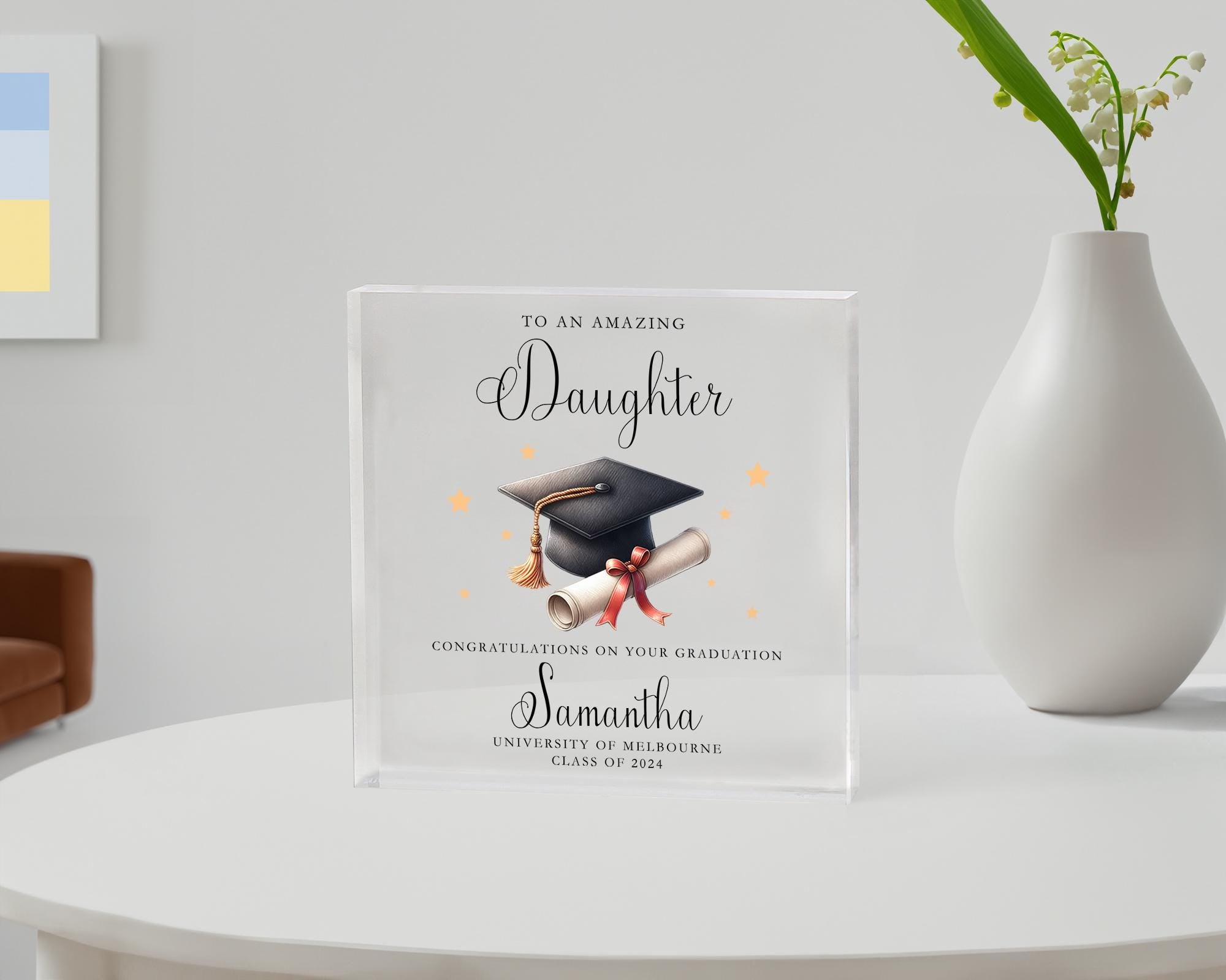 Each 10x10cm Acrylic Plaque is expertly customized with the name of the graduate, making it a truly one-of-a-kind keepsake that will be cherished for years to come. Our state-of-the-art UV printing technology ensures a vibrant and long-lasting design that captures every intricate detail, giving this gift an elegant and sophisticated touch.